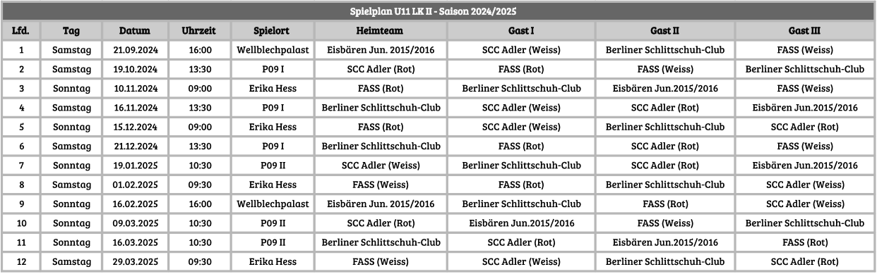 | 10.11. | 14:10 | F.A.S.S. (rot) | 33 : 1 | Berliner Schlittschuh-Club | ||||