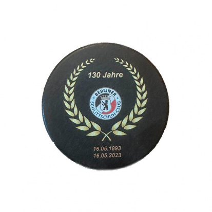 Maße/Gewicht wie ein Spielpuck (ca. 165g)Motiv: gedruckt, einseitig1 Zoll (2,54 cm) hochDurchmesser 3 Zoll (7,62 cm)Material: Hartgummischeibe aus vulkanisiertem Gummi