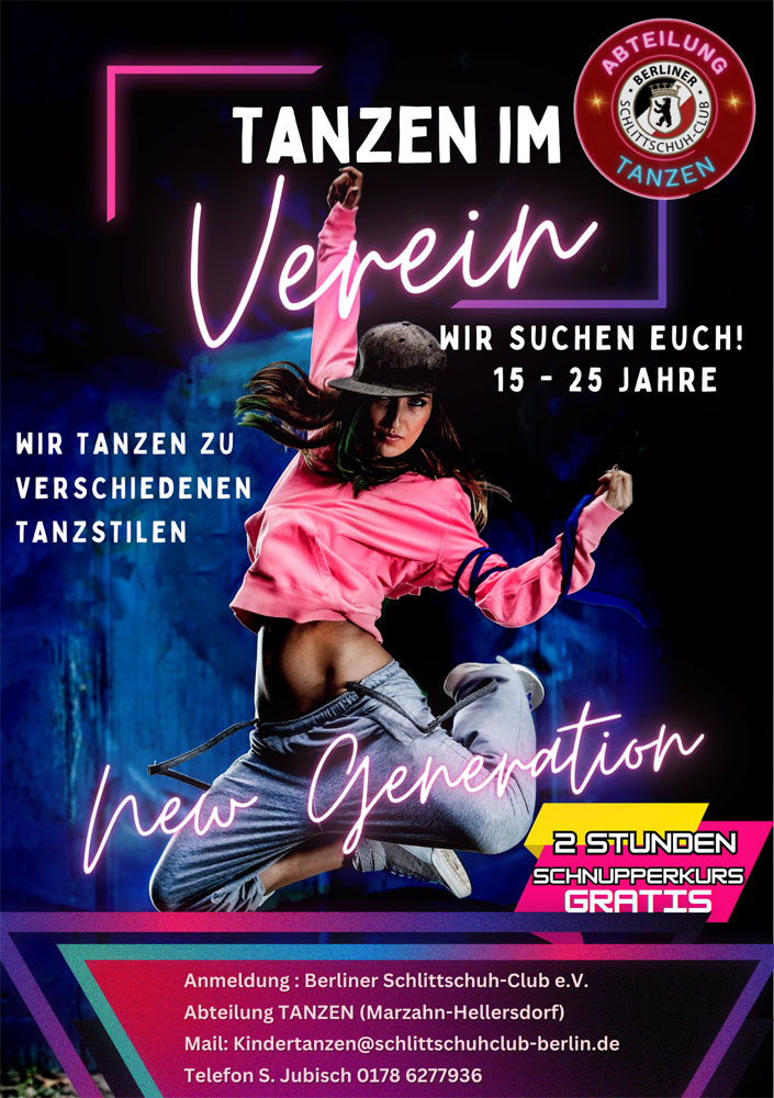 Wir sind vom Berliner Schlittschuh-Club e.V. Abteilung Tanzen ein gemeinütziger Verein, bei uns kann man ab 2 Jahren mit viel Spaß anfangen zu tanzen.